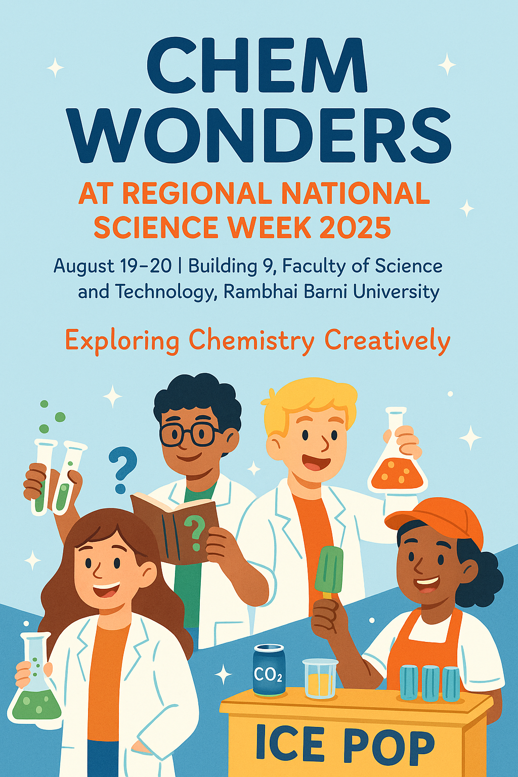 ภาควิชาเคมี คณะวิทยาศาสตร์และเทคโนโลยี มหาวิทยาลัยราชภัฏรำไพพรรณี เตรียมจัดกิจกรรมส่งเสริมการเรียนรู้ทางวิทยาศาสตร์ ภายใต้ชื่องาน “Chem Wonders – เปิดโลกเคมีอย่างสร้างสรรค์” ซึ่งเป็นส่วนหนึ่งของงาน “สัปดาห์วิทยาศาสตร์แห่งชาติ ส่วนภูมิภาค ประจำปี 2568” ระหว่างวันที่ 19–20 สิงหาคม 2568 ณ อาคาร 9 คณะวิทยาศาสตร์และเทคโนโลยี