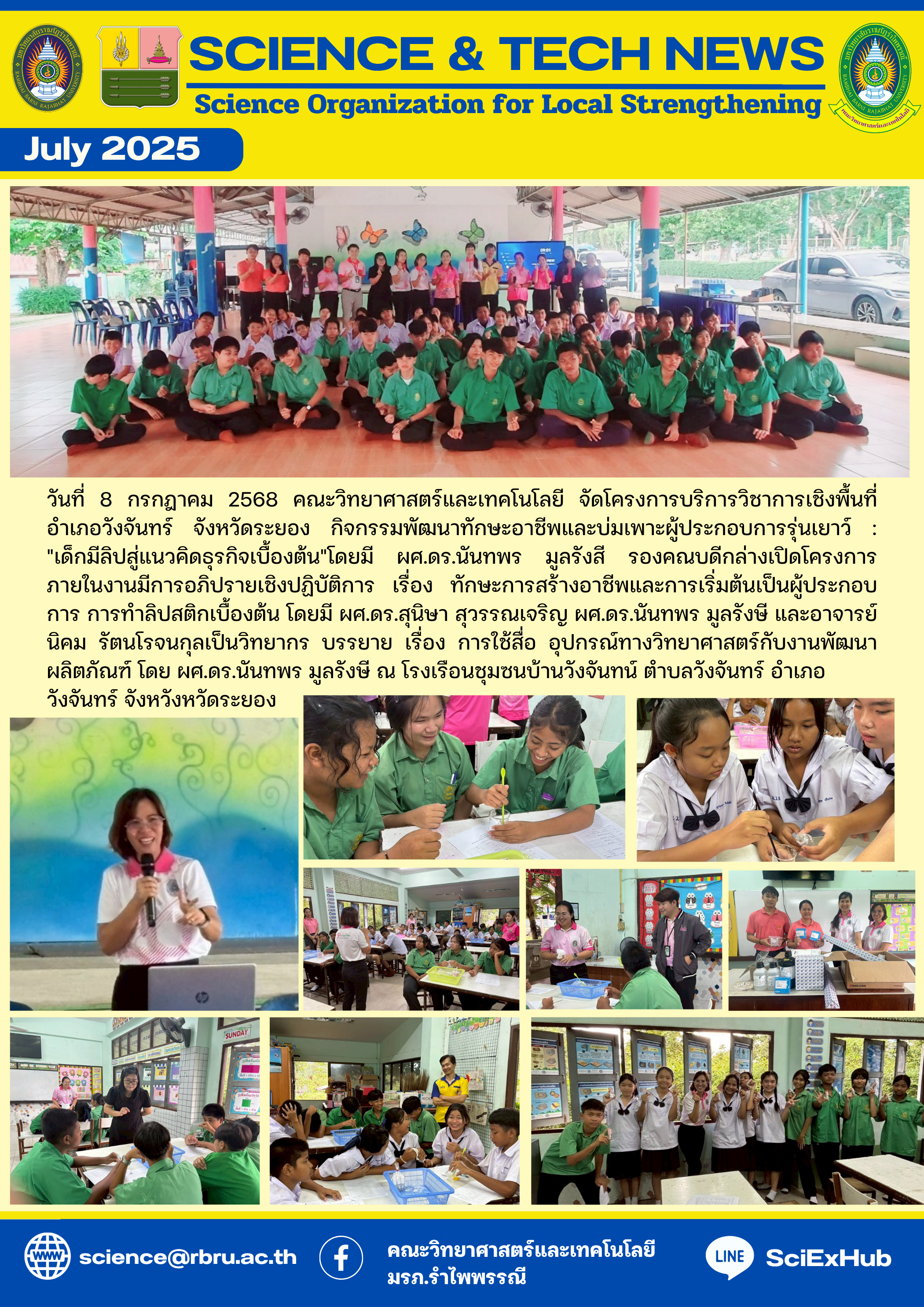 ณะวิทยาศาสตร์และเทคโนโลยี จัดโครงการบริการวิชาการเชิงพื้นที่ อำเภอวังจันทร์ จังหวัดระยอง กิจกรรมพัฒนาทักษะอาชีพและบ่มเพาะผู้ประกอบการรุ่นเยาว์ : "เด็กมีลิปสู่แนวคิดธุรกิจเบื้องต้น"